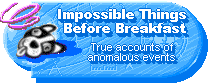 Impossible Things Before Breakfast is a cartoon exploration of actual anomalous, infranatural events common to my life. I am no stranger to the strange, and these true accounts of the bizarre are as exactingly accurate as I can make them. |