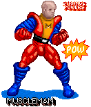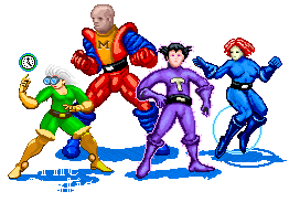 The Harvard and Princeton educated members of the Castigation Camarilla set out to teach, with a vengeance! They are MUSCLEMAN, possessed of Ultimate Strength, CHRONOGAL, who has the power to reverse time on a small scale, TELEPORTO, gifted with the power to teleport surprizing amounts of mass, and FORCEFRAN, who can use her mind to make perfectly round bubbles of impenetrable force.
