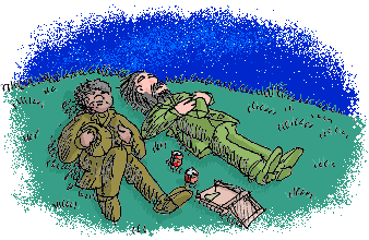 On the other hand, Rubby's sleep was somewhat less agitated. It fact, he slept like a baby. When he woke up, he was wet. But then, so was Chuck. Mr. Sun's bald, shiny head had just popped up near downtown when the park's automatic lawn sprinklers roused both men.