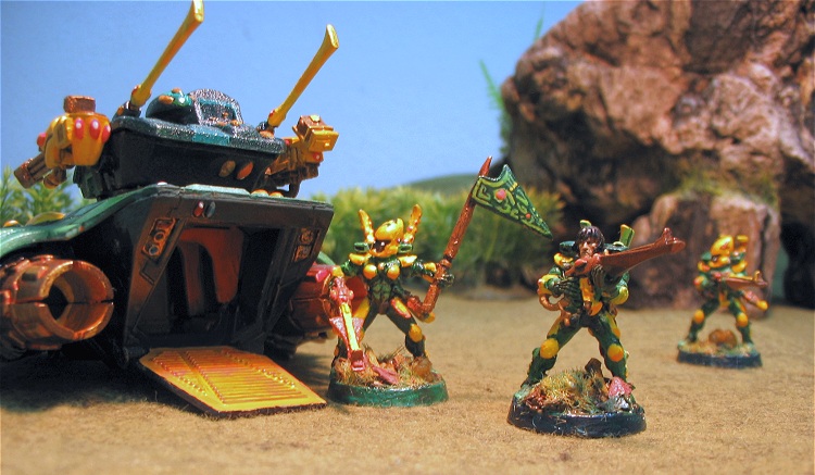 You would think that something worth 200 points would be less apt to misfirings than my poor Falcon - so far the dice haven't been in my favor when I've tried to fire it.  It hs proven tremendously useful in the conveyance of troops, though, and made me long for it's larger companion, the Wave Serpent.  Since the Patchwork can only hold up to 6 figures at a time, it's not much good for taking a Guardian squad along....and there's no way the Wraithguard can fit inside.  This leaves the Warlocks, Farseers, and Pathfinders as the only viable passengers in my troops, right now.