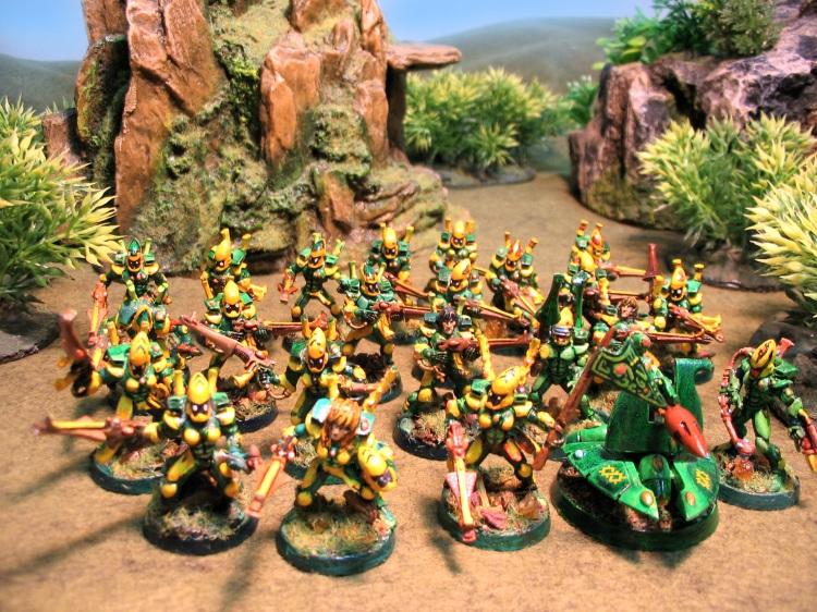 "For centuries we've scoured the universe in search of our beloved lost home. Rumors, legends, hints...are all we had to go on. Each Gate's opening a mix of hope and dread, what would be discovered? Memories of cool green shade and sweet waterfalls cascading to languid ponds formed images in the shadows of our campfire's light and echoed in the songs we sang to keep our spirits high. Now we've found it, or so we think....and half at least is gone to ruin. Necron spines litter the desert, telling the tale of it's creation. As we staggered through the gates yet another discovery was to be made...this newest of Races, this ....this Tau!"