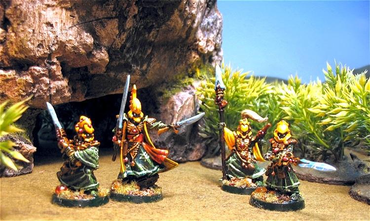 Calentar Eldalon Warlocks: Thalion Thol & Rison Curu Just as Jennifer's Etherials are likened to the Three Stooges, these two inseperable lovers are more the Odd couple of the Eldar force. Thalion is very much Oscar. More apt to wade into trouble without forethought or consideration of the possible consequences, only luck has saved him from his many reckless rushes into the very eye of the fray. A roll of Rison's eyes and a shrug of those beloved shoulders are the only things likely to put Thalion into fits of insecurity. Bluster should be this guy's middle name. He's known to swagger around the camp after a battle, showing off his scars and spirit stones, and telling whoppers the size of a Devilfish. Rison is our Felix. Often at a loss at what to do to rein in his "better half", and usually seen trying to wash the errant blood stains out of his lover's robes. More quiet than Thalion, Rison likes to play the flute and is oft heard quoting obscure Elven sages and texts of old in mystically cryptic was that are left open to the hearer's interpretation.