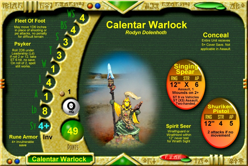 Calentar Eldalon Warlock Rodyn Dolenhoth Rodyn tends to feel a bit like a third wheel around his fellow Warlocks, and is prone to shadowing the Farseer Tirhae. Some say he's hoping to reap the rewards of Suletur's vast knowledge; some say he has a crush on him, or that he has some sort of bizarre father image fixation. Bootlicker is a more accurate term, and if there's a way he can see to make himself seem the more loyal of the Warlock Guard, he'll find it. Dolenhoth's not above besmirching the good name of his squadmates, and it's a darn good thing that his commander knows him well enough to ignore his petty attempts to undermine Thalion and Rison. Because of his tendency to "not play well with others" Rodyn is rarely entrusted with missions of any major import. That's really a shame, though....'cause despite his tendency for brown nosing he's a good shot, and he's hoping to get a chance to prove it...Soon!