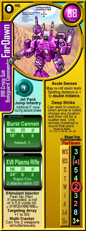 Bodyguard Commander Far Dawn (Shas'O Vas'Quez Tor'kan'Rotaa) is perhaps the only experienced member of the problematic Vas'Quez mission. A gruff and worldly battlesuit veteran, Far Dawn fought Orks and supported commanders before Commander WarmRain was even born. Far Dawn's knowledge is legendary, but his skills are waning, and age and injury have slowed him down. Worse, he has become hopelessly addicted to the drug used in his Battlesuit's stimulant Injector, slipping off every half an hour "To check his suit". Thanks to political connections with the stimulant lobby in the Tau capital, he was to be retired to a particularly luxurious pensionm - one that angered a long time rival in the upper heirarchy of the Tau Fire Caste who is opposed to stimulant use.
