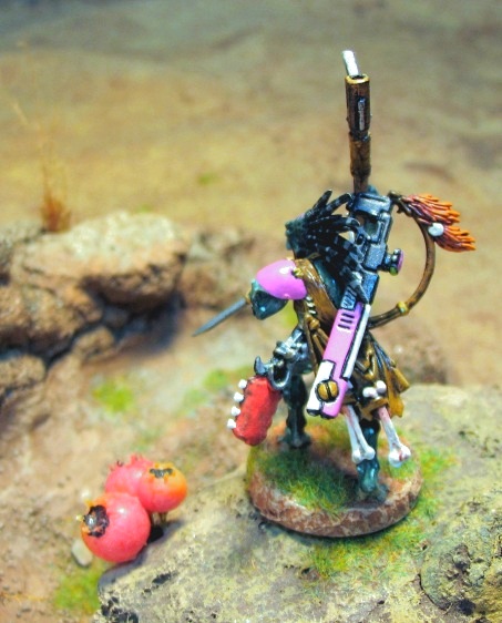 sniper sight on his bladed Kroot Rifle, blood stains on several of