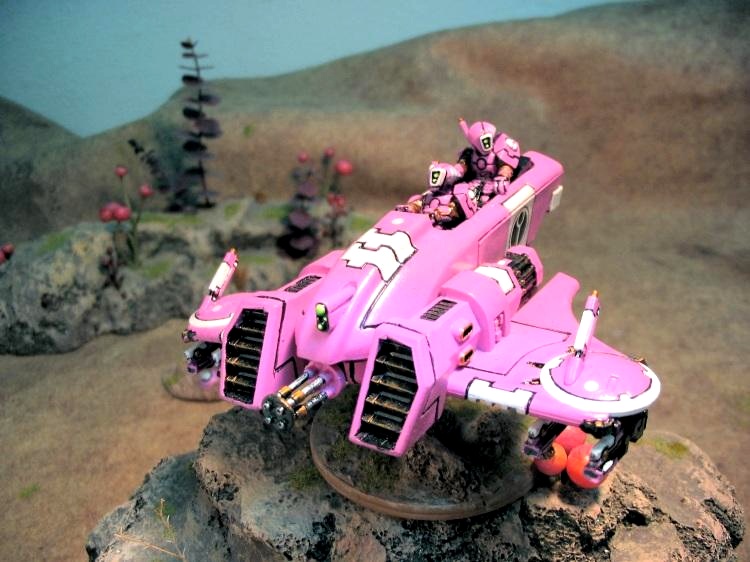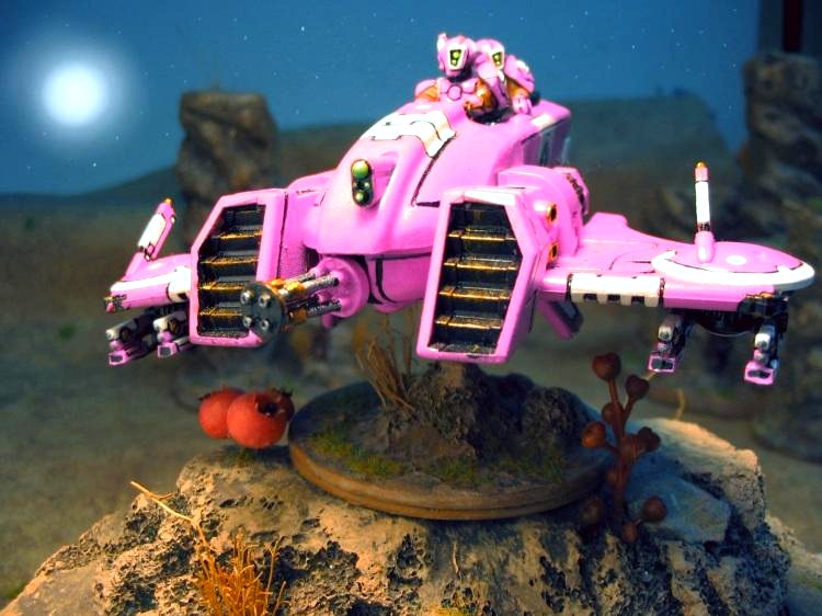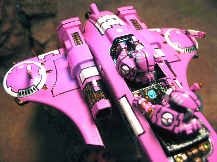 About the Miniature: I like the look of the Tau Piranha, and tried to be very neat. I spent a lot of time doing the control panels (below). Also, I wanted to be able to disembark the troops inside -after all, they count- and so I customized the model so that it was possible to remove the pilot figures entirely, leaving an empty vehicle... something the model was not built to do. The base has dry grass made from broom material on it to enhance the desert look.