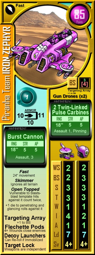 Piranha Team Iron Zephyr From out in the desert night comes a shriek of speed and fury. A heliotrope blur whines past, skimming the ground like a low flying hawk. The enemy cowers in horror as the winged bullet tears the very air, ripping the sky overhead. The horrific bird of prey receeds in the distance, out of control, out of mind, out of ammo. Once again, Commander WarmRain slaps her forehead, looks at her booted hooves, and sighs.