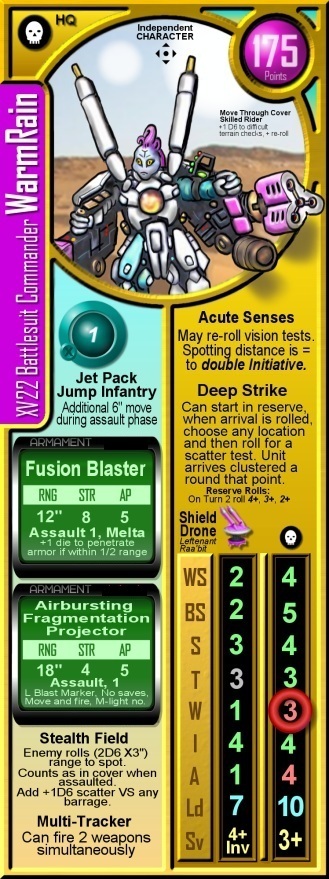 Before WarmRain (Suam'Por) became an experimental battlesuit commander, she originally served as a Fire Caste test pilot for a Tau Battlesuit Research and Development center. She was one of the many pilots that helped test the first XV22 Battlesuits to be constructed; she is special only in that she is one of the few that survived.